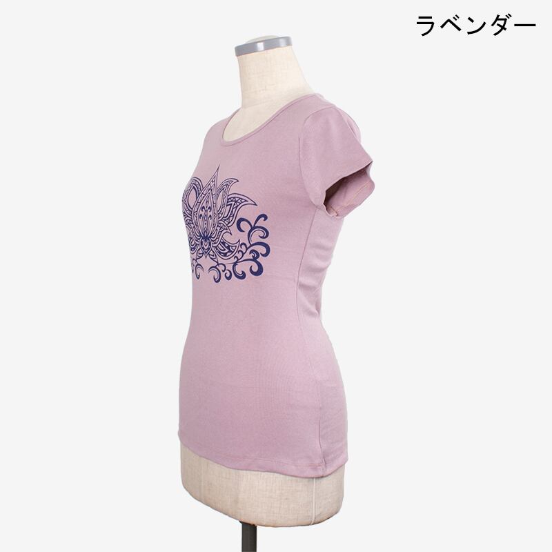 T-shirts made with an elastic rib jersey material. A big lotus is printed on the front and 7-chakra symbols are printed on the back. These are products from Amina Collection.